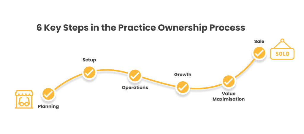 While there is a lot to consider throughout the full journey of practice ownership, the following gives an overview of 6 key steps in the practice ownership process. These 6 steps are: