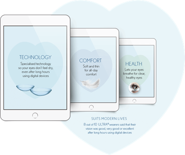 Bausch + Lomb ULTRA contact lenses provide an exceptional combination of comfort, vision and health for your digital lifestyle. With its unique MoistureSeal™ technology Bausch + Lomb ULTRA contact lens offers moisture retention for a full 16 hours, and it helps to prevent dehydration blur. Ultra soft, ultra breathable contact lenses suitable for all-day wear and for up to 7-days extended wear, replaced on a monthly basis.*