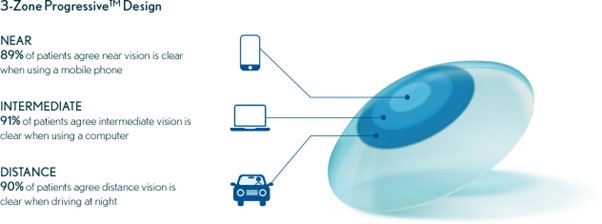 The 3-Zone Progressive™ Design delivers outstanding near, intermediate and distance vision. It provides a smooth, quick transition that lets you see clearly even as your eyes change focus from one zone to another, without blurriness. A design that gives you clarity in real-world experiences.