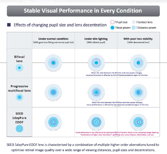 There is an increasing number of presbyopes wearing contact lenses today. SEED has been striving to meet their demands for good vision at all visual distances regardless of environment, so they can see clearly for every occasion. Working jointly with the Brien Holden Vision Institute, a world-renowned research institution, SEED is now able to offer an innovative contact lens for presbyopia.